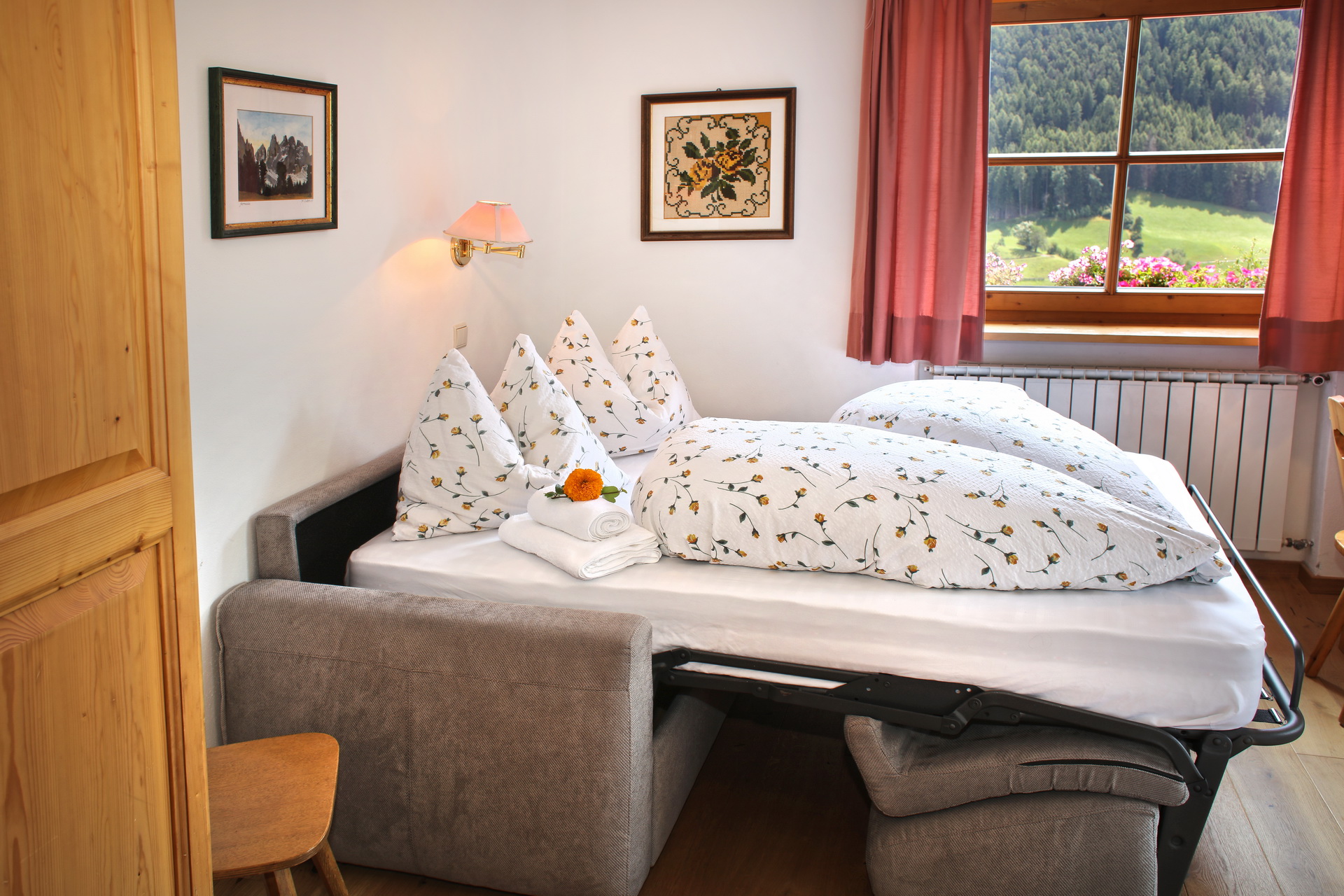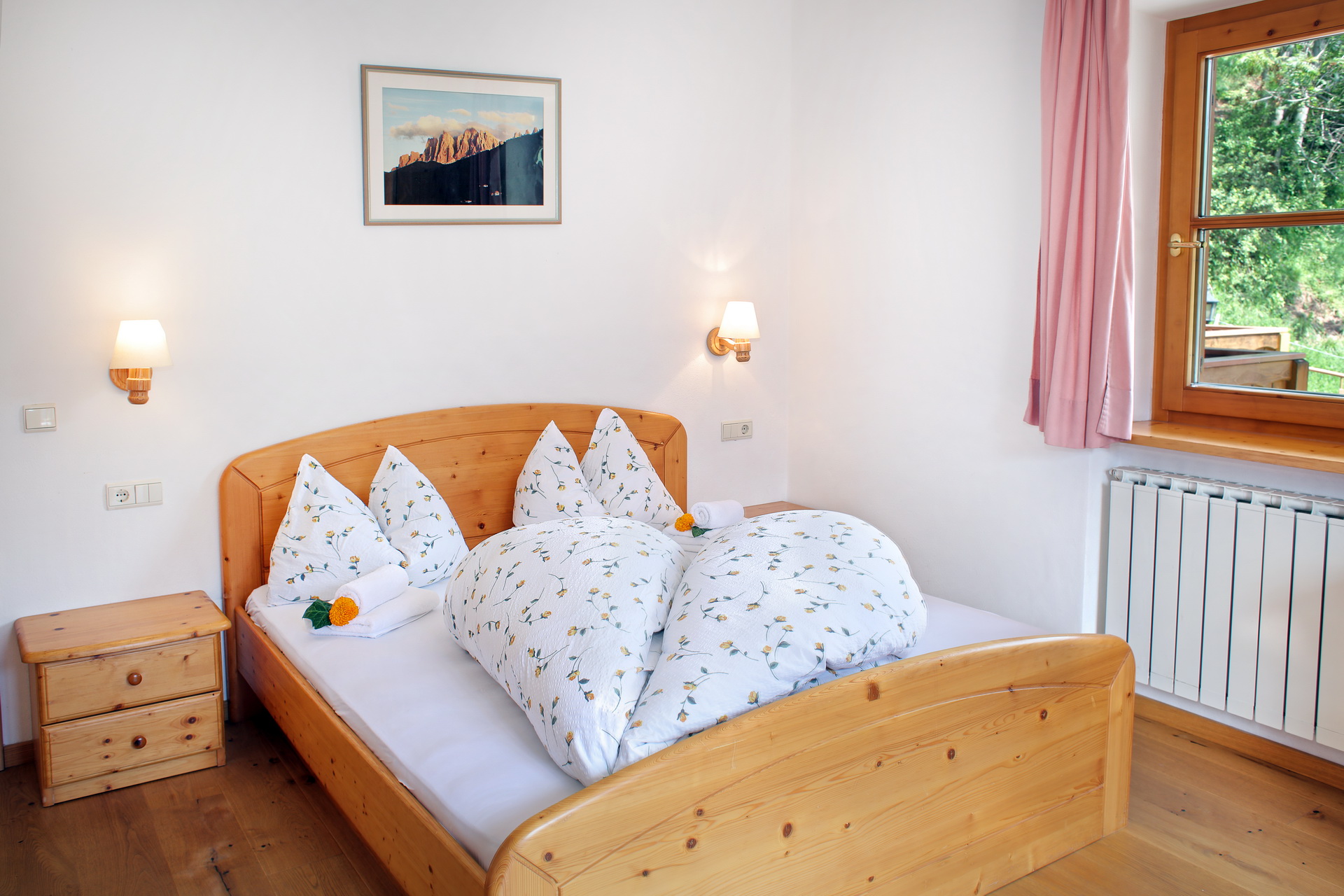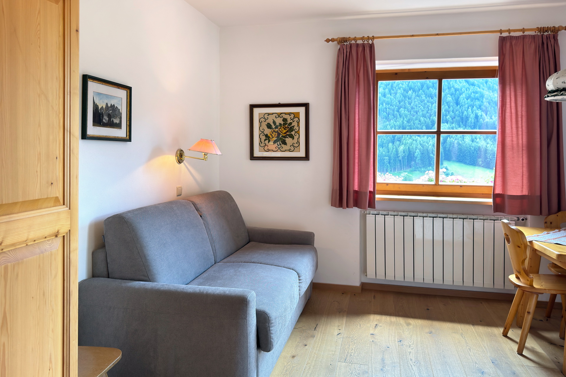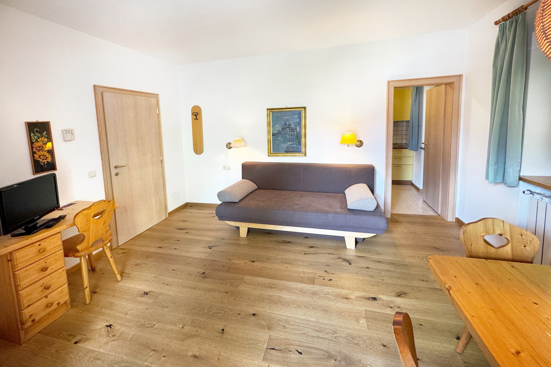 Gli appartamenti hanno una camera matrimoniale, soggiorno con divano, cucina moderna, WC indipendente, TV, balcone soleggiato verso sud da dove si vedono benissimo le nostre belle odle.