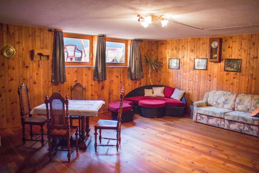 ampio spazio privato composto da due divani, tavolo con sedie, grande televisore.